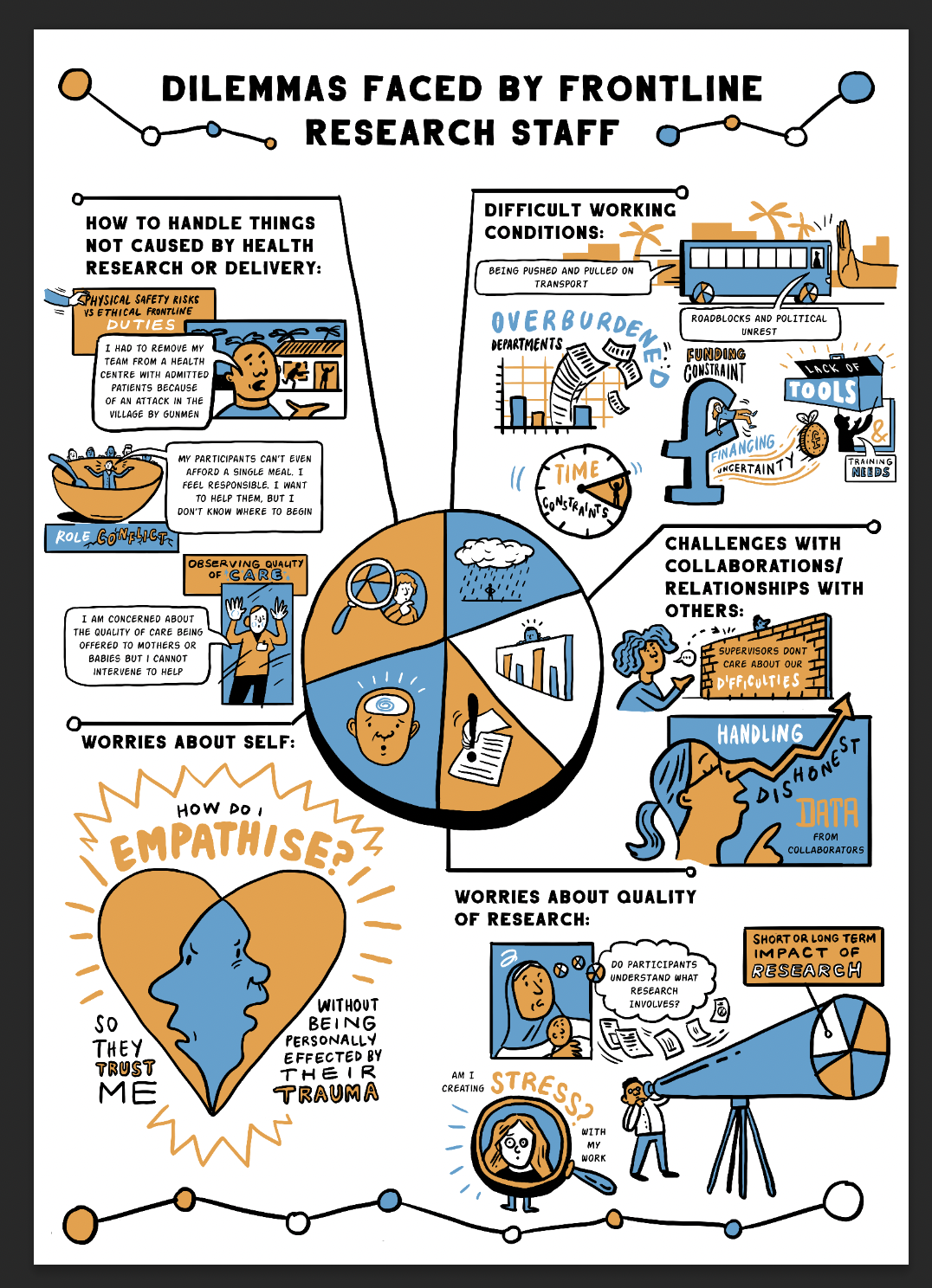 Frontline staff play critical roles in the ethical conduct of quality research, in healthcare service delivery and in wider health system functioning. Their daily work involves interactions with patients, research participants, and community members, which can present significant practical challenges and stress. These challenges may have adverse implications for staff well-being, team relationships, quality of care and research, and patient outcomes. In low-resource settings, the nature and drivers of the challenges and distress faced by frontline research staff are poorly understood, including how these are changing with current funding cuts in ‘global health’. Moreover, there is little practical guidance for leaders and funders on how research/systems might be set up and support processes organised to minimise and manage moral distress among frontline staff. The ROOTS programme of work has as a core focus frontline staff involved in knowledge production/research. However, there are grey areas and overlaps between research and service provision staff in health systems, and so we include learning from health and research literature and activities.